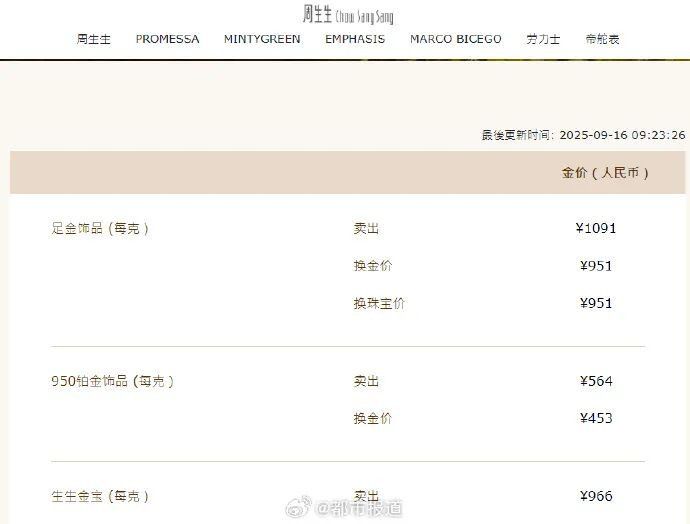 9月9日,记者查询发现,周生生金饰品克价涨至1091元,较前一天涨了17元;老庙黄金金饰品克价涨至1087元,较前一天涨了11元万盈配资,周大福金饰品克价涨至1087元,较前一天涨了13元。