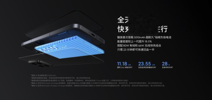 据介绍,魅族22搭载了5510mAh电池,为魅族旗舰机型史上容量最大的电池,同时配备有线、无线多规格快充方案,官方称其为魅族旗舰史上续航体验最优的产品。