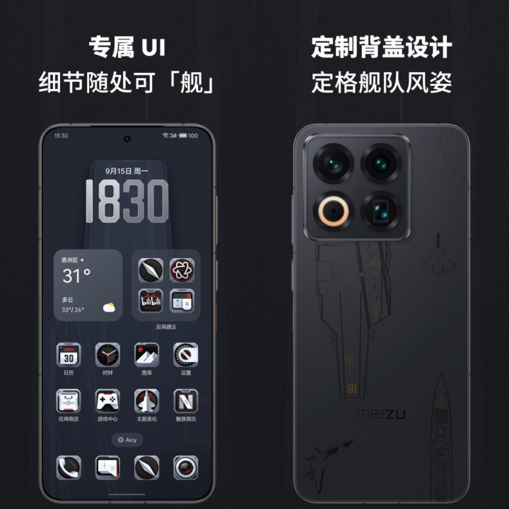 “One More Thing”,除了常规版本外,魅族这次还推出中华旗舰限定版,搭配专属UI,手机背盖还联名航母战斗群元素,包含福建舰、055、J35等标志性形象。